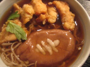千葉県代表なので千葉県産の鶏肉天(点をとる、の語呂合わせ)を使おうと思いました。地元松戸市の川光物産の白玉粉で作ったラグビーボールを載せます。点をいっぱい取ってほしいので「トライそば」と名付けました。